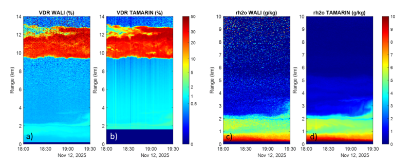 Les premières mesures significatives ont été obtenues le 12 novembre 2025 et comparées à celles du lidar météorologique WALI du DRF/LSCE, utilisé comme référence. La Figure 2 (a et b) montre la dépolarisation de la lumière laser, utilisée pour caractériser les aérosols et les nuages. Les deux lidars donnent des résultats très similaires et révèlent la présence d’un nuage de glace de type cirrus entre 9 et 12 km d’altitude. Le contenu en vapeur d’eau est également restitué à partir des mesures de WALI (Figure 2c) et de TAMARIN (Figure 2d). TAMARIN se distingue par un niveau de bruit nettement plus faible, tout en reproduisant fidèlement les structures de vapeur d’eau observées par WALI. Ces premiers résultats atmosphériques confirment la conformité de TAMARIN au cahier des charges ACTRIS-EU pour les mesures troposphériques. La prochaine étape consistera à étendre les tests à la stratosphère, avec la perspective, d’ores et déjà établie, que les canaux élastiques permettront de sonder l’atmosphère bien au-delà de la stratopause, au-dessus de 40 km d’altitude.