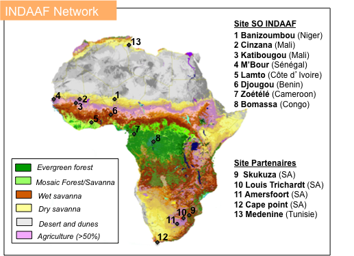Le réseau INDAAF est composé de 8 sites participants en Afrique de l’Ouest (Niger, Mali, Sénégal, Bénin, Côte d’Ivoire) et Centrale (Cameroun et Congo) et de 2 sites réseaux (Afrique du Sud et Tunisie). Chaque site est représentatif à l’échelle régionale d’un grand écosystème africain avec ses caractéristiques en termes de sources d’émissions (émissions biogéniques, animales et domestiques, aérosols désertiques, feux de biomasse…) et sa sensibilité aux changements climatiques, écologiques et anthropiques. Ainsi, les stations sont réparties sur un gradient nord-sud à des bandes de latitude à pluviométrie croissante pour représenter les écosystèmes de savane sèche (Niger, Mali, Sénégal), humide (Mali, Côte d’Ivoire, Bénin) et l’écosystème de forêt (Cameroun, Congo). Elles permettent également d’échantillonner un transect sahélien est-ouest (3°E à 17°O), sur le trajet des aérosols terrigènes Sahariens et Sahéliens vers l’Atlantique Nord-tropical. Les sites réseaux permettent de documenter un écosystème de savane sèche de l’hémisphère Sud et un site de steppe de zone aride (Tunisie). Les caractéristiques des différentes stations sont données sur le site web : https://indaaf.obs-mip.fr/network-2/.